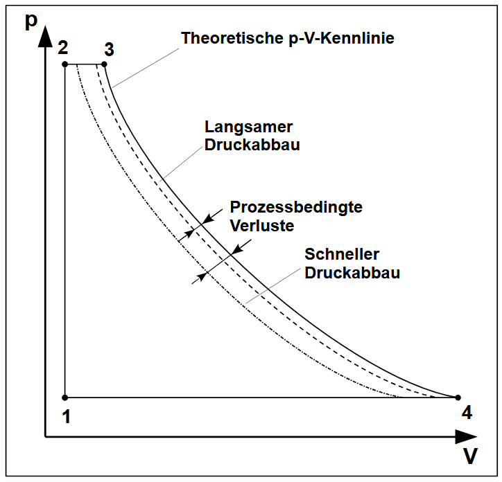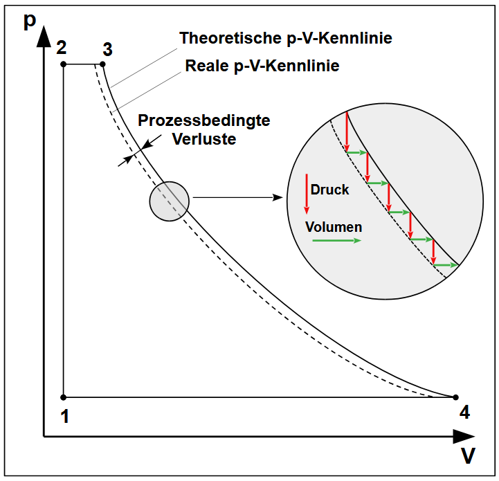 Die kontinuierliche Volumenvergrößerung, unter dem jeweils aktuellen, abnehmenden Druck, entspricht dabei der in mechanischen Energie umgewandelten Wärmeenergie, die von der Wärmekraftmaschine aufgenommen und in eine mechanische Bewegung (z.B. eine Rotation) umgesetzt werden muss.