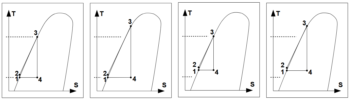 Das zweite Diagramm von links zeigt eine Erhöhung der Eintrittstemperatur wie sie z.B. bei Nutzung von solarthermischer Wärme im Tagesverlauf auftreten kann.