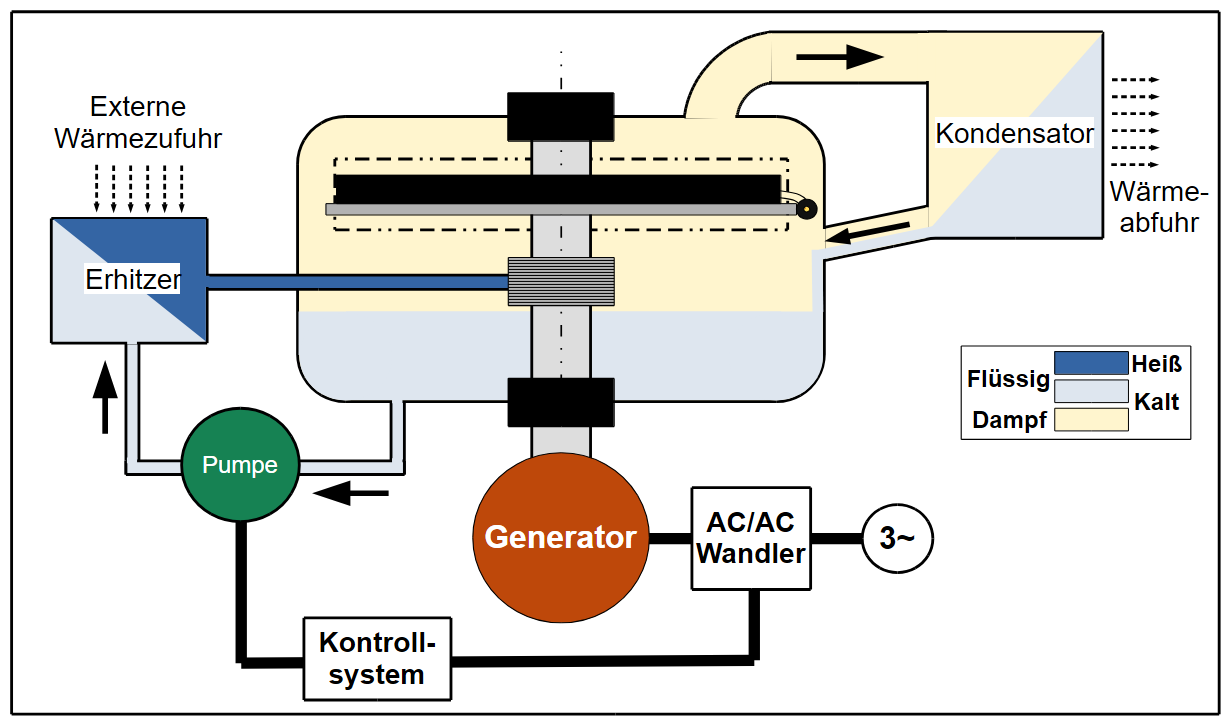 Mittels des drehzahlvariablen Generator und des AC/DC/AC-Wandlers können somit Variationen der Eingangs- und der Kondensationstemperaturen in einem großen Bereich flexibel genutzt werden.